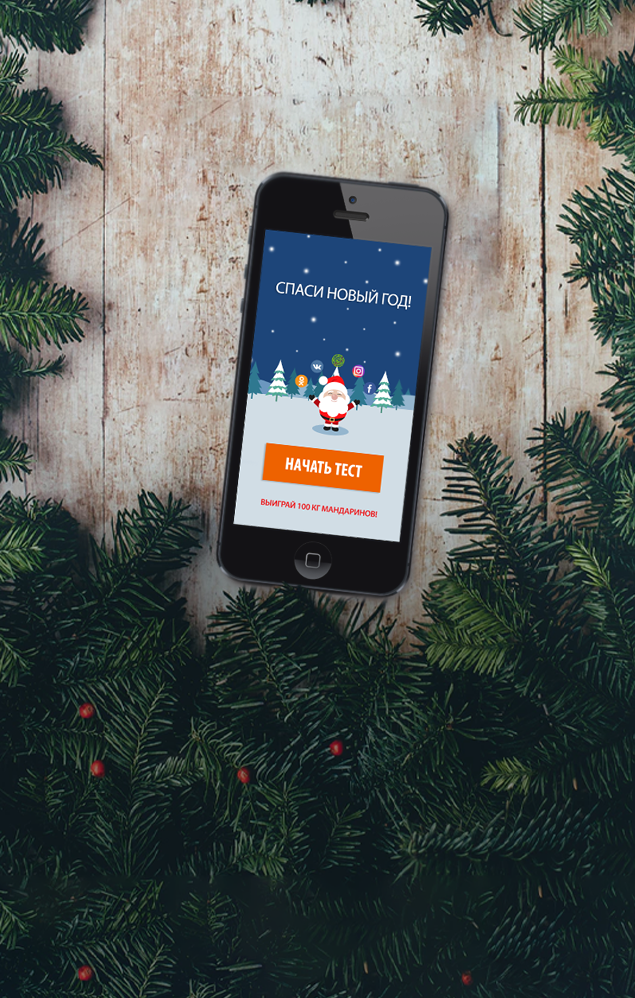 а не дорогостоящий приз — неотъемлемый атрибут новогодних праздников — мандарины. Участники не просто проходили тест, а узнавали свой вклад в спасение Нового Года. В зависимости от количества верных ответов, каждый получал купон, дающий шанс выиграть один из четырех «ящиков». Важно было убедиться, что участники оставляют существующие электронные адреса и телефоны. Для этого на landing page был реализован механизм автоматической отправки проверочного письма - поздравительного купона с указанием порядкового номера участника и веса возможного выигрыша. По итогам проекта было разыграно 100 килограммов.